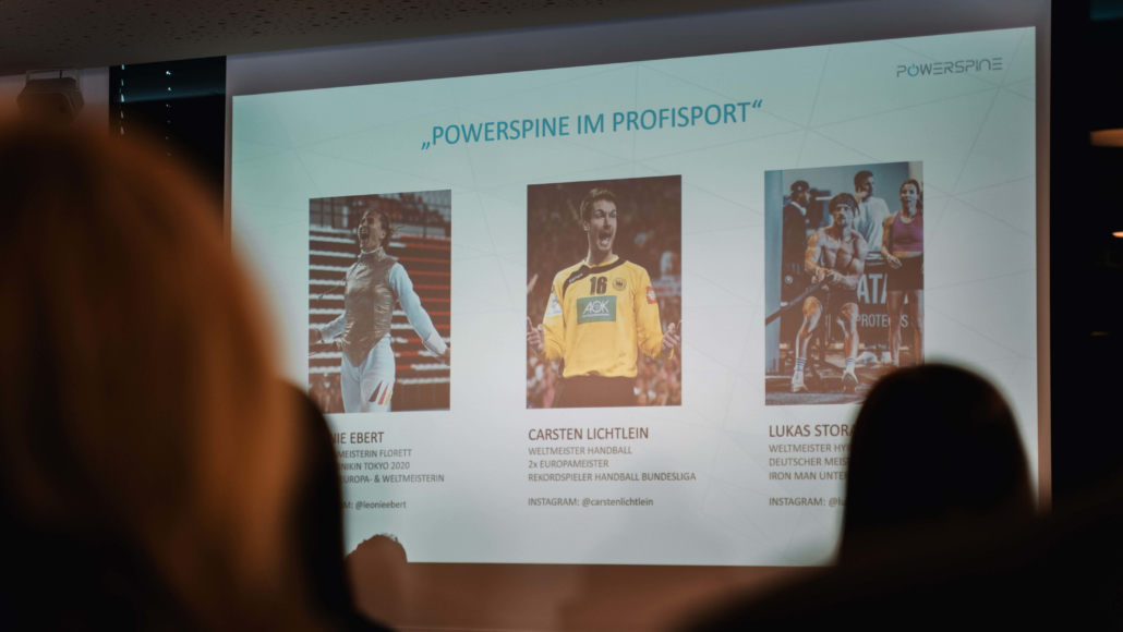 Im zweiten Teil der Veranstaltung gab Neurobiologe und Sportwissenschaftler Dr. Christoph Spang einen Überblick zu aktuellen wissenschaftlichen Erkenntnissen und zeigte eindrucksvolle Therapieergebnisse basierend auf radiologischen Befunden. Die Muskulatur, die bei chronischen Rückenpatienten fast immer abgebaut ist, kann durch das Powerspine Training nachweislich wieder hergestellt werden. Das Highlight des diesjährigen Kongresses waren jedoch die Spitzensportler. In einer abschließenden Diskussionsrunde, moderiert vom Powerspine Geschäftsführer, Sebastian Färber, berichteten die Profisportler Leonie Ebert (Fecht-Europameisterin), Carsten Lichtlein (ehemaliger Handballnationaltorhüter und Weltmeister) und Lukas Storath (Hyrox Weltmeister) über ihre Leidensgeschichte mit Rückenschmerzen und Bandscheibenvorfällen und den positiven Erfahrungen mit dem Powerspine System.